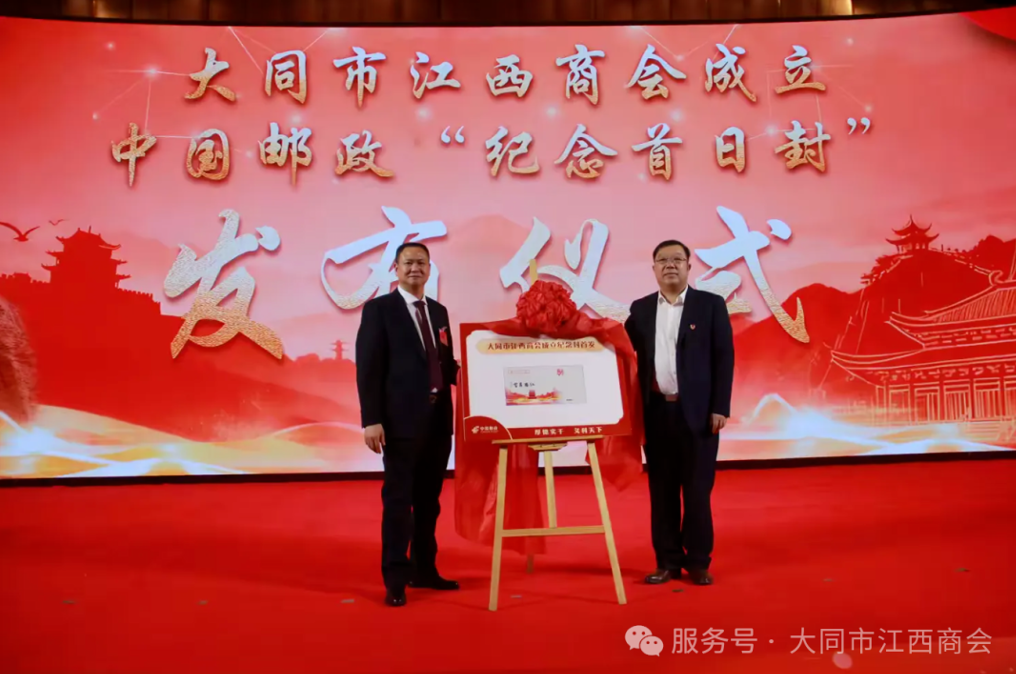 合影结束后,中国邮政集团为祝贺大同市江西商会成立发布“纪念首日封”,以方寸之间的艺术魅力铭刻下这一具有历史意义的时刻,成为大会的珍贵纪念。